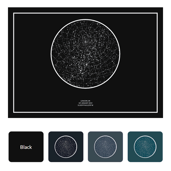 Choose your favorite color, elements, layout and size to your star map.
